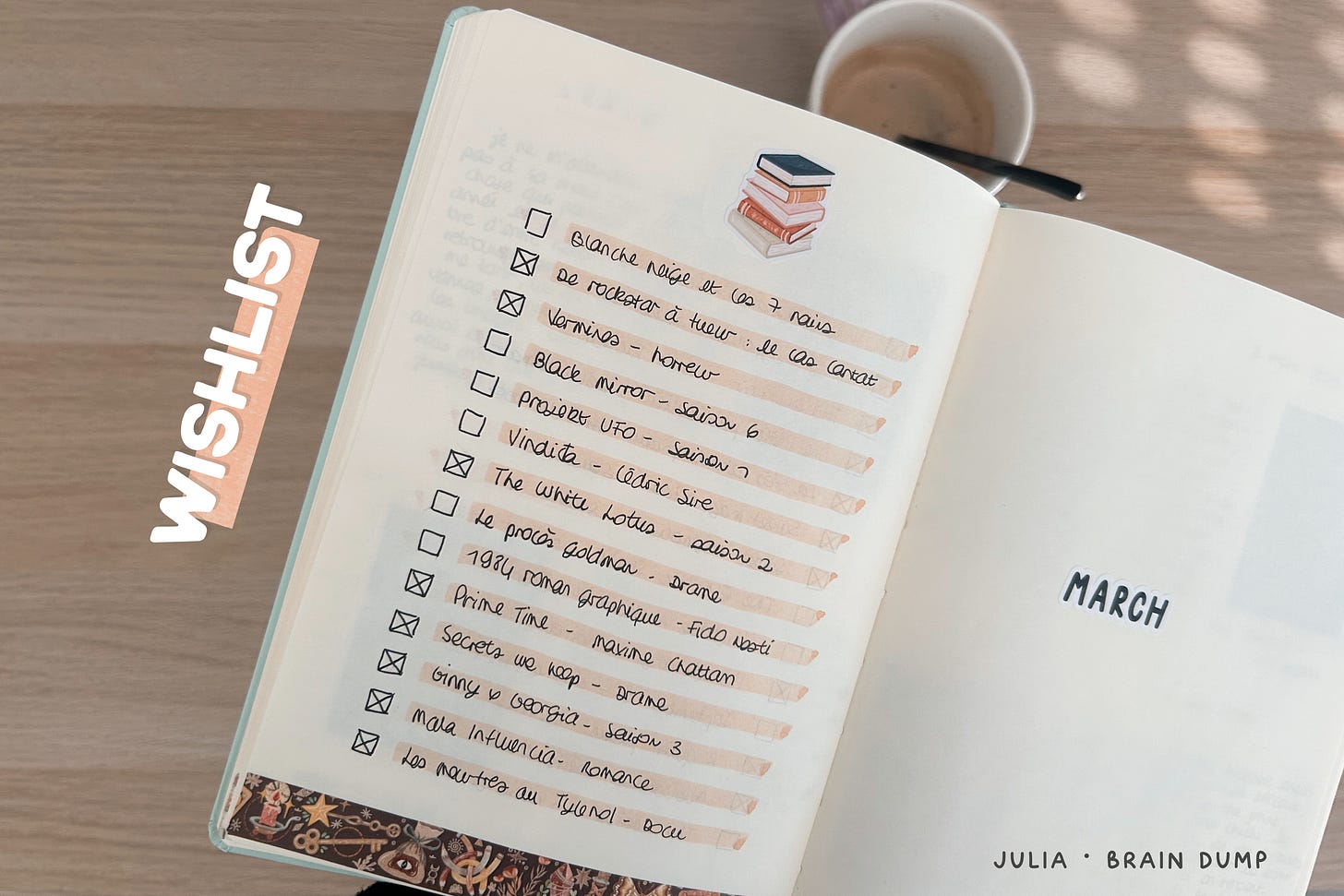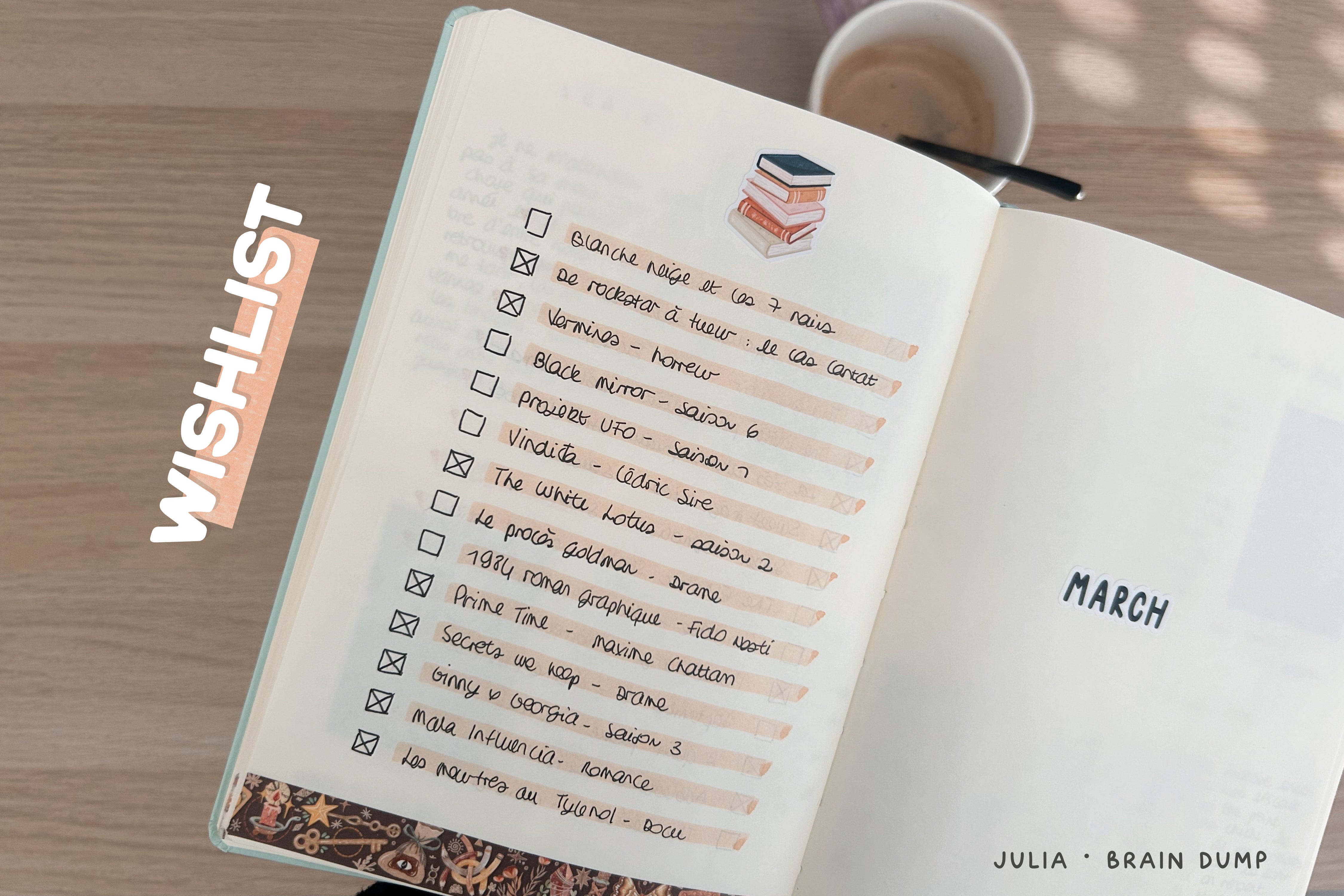 Ni plus ni moins que toutes les choses que je veux lire et regarder. Dès qu’une page wishlist est remplie (recto/verso), j’en crée une autre à la suite et je viens noter son emplacement dans mon sommaire. Et puis je viens cocher au fur et à mesure ce que j’ai consommé.