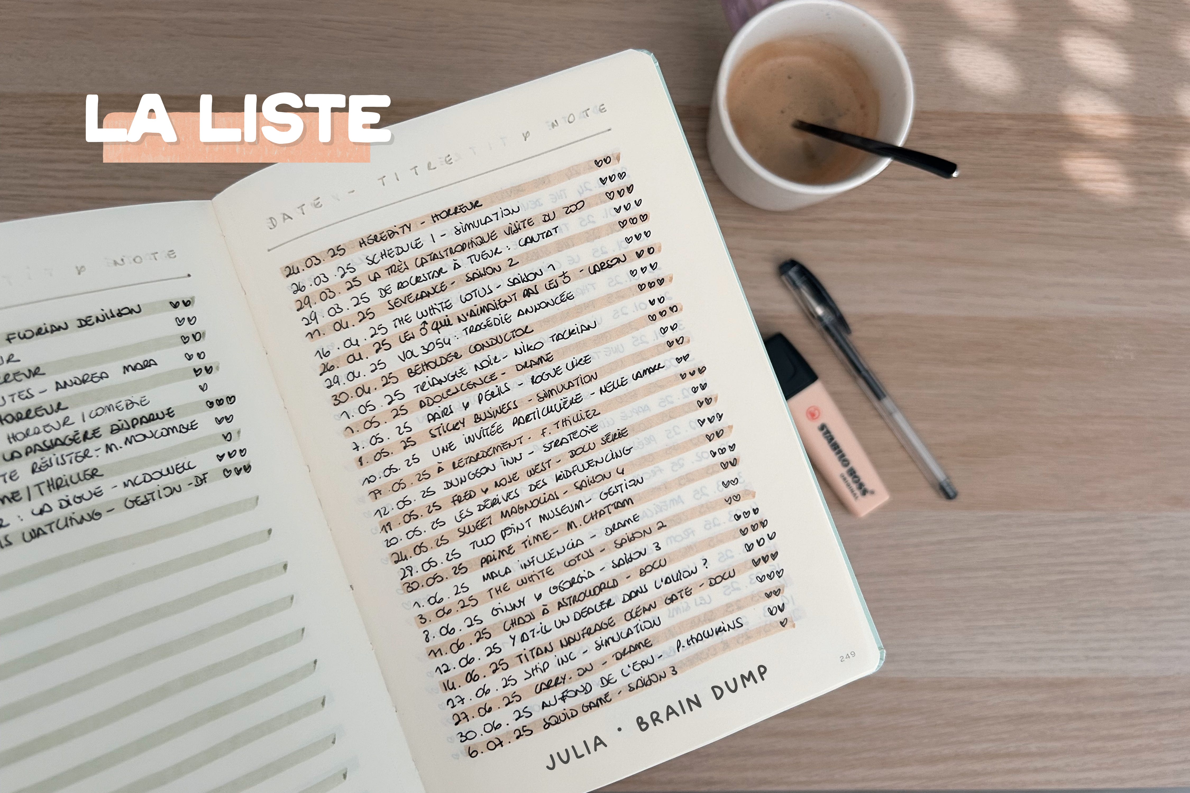 Situées à la toute fin de mon carnet (je remplis le carnet par la fin finalement !) ces pages ne sont qu’un gros récapitulatif de toutes les oeuvres avec : la date, le titre de l’oeuvre et ma note sur une échelle de 1 à 3 coeurs 🤓